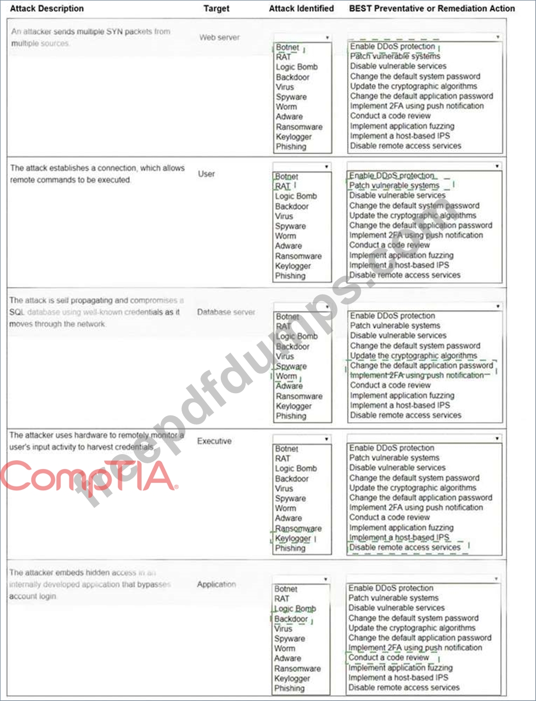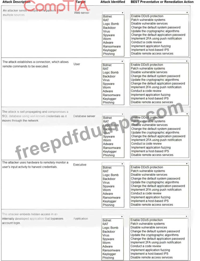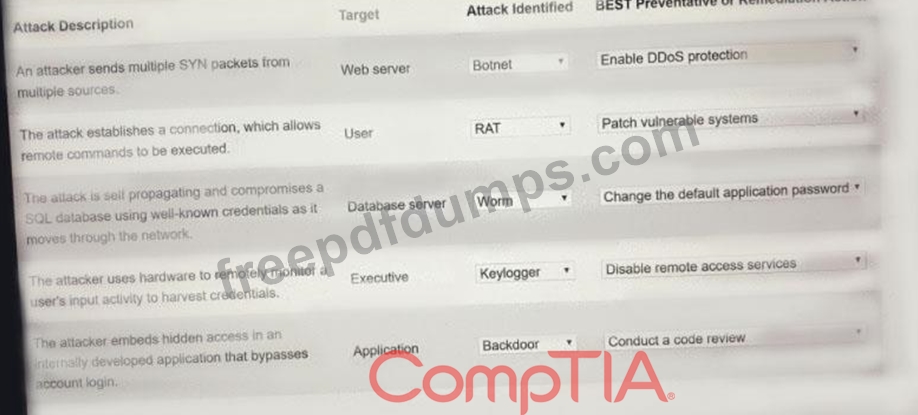 Select the appropriate attack and remediation from each drop-down list to label the corresponding attack with its remediation.