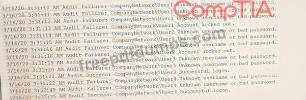 A security analyst needs to determine how an attacker was able to use User3 to gain a foothold within a company's network. The company's lockout policy requires that an account be locked out for a minimum of 15 minutes after three unsuccessful attempts. While reviewing the log files, the analyst discovers the following: