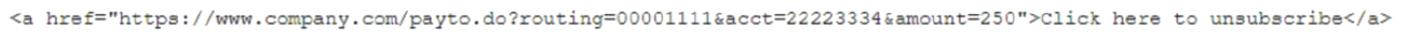 A forensics investigator is examining a number of unauthorized payments that were reported on the 00mpany's website. Some unusual log entries show users received an email for an unwanted mailing list and clicked on a link to attempt to unsubscribe. One of the users reported the email to the phishing team, and the forwarded email revealed the link to be: