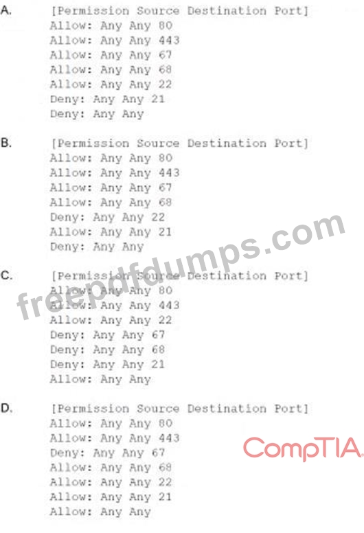 An administrator is configuring a firewall rule set for a subnet to only access DHCP, web pages, and SFTP, and to specifically block FTP. Which of the following would BEST accomplish this goal?