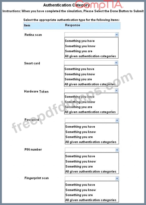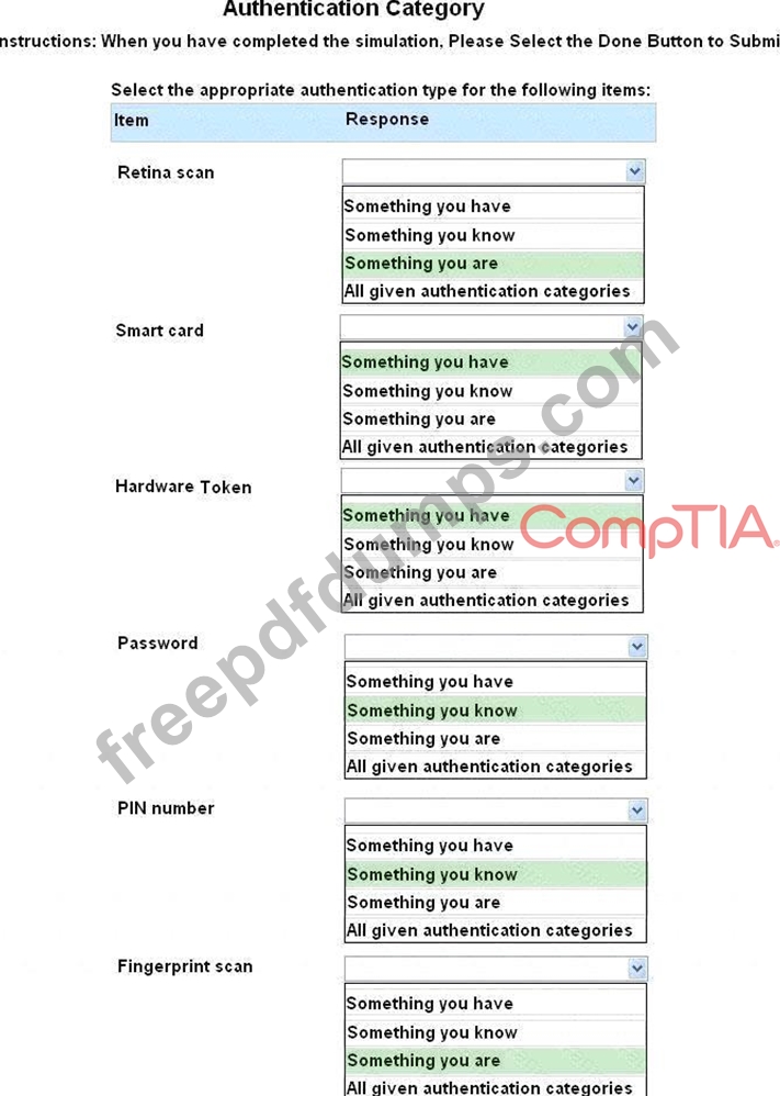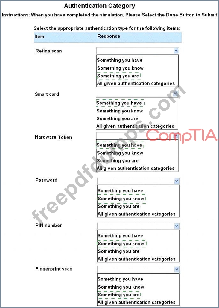 For each of the given items, select the appropriate authentication category from the dropdown choices.
