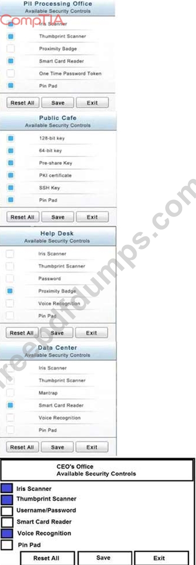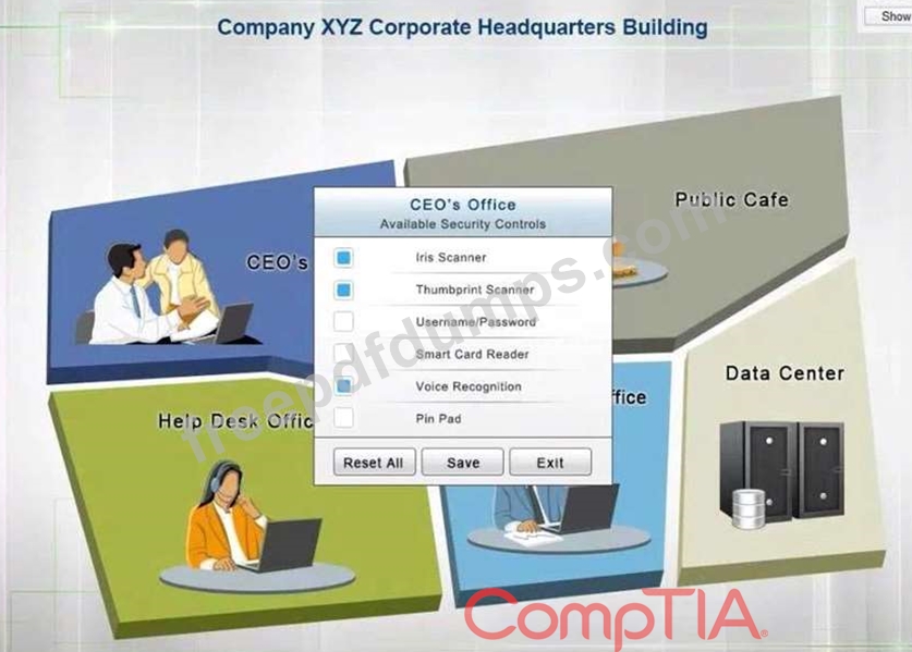 Instructions: The original security controls for each office can be reset at any time by selecting the Reset button. Once you have met the above requirements for each office, select the Save button. When you have completed the entire simulation, please select the Done button to submit. Once the simulation is submitted, please select the Next button to continue.