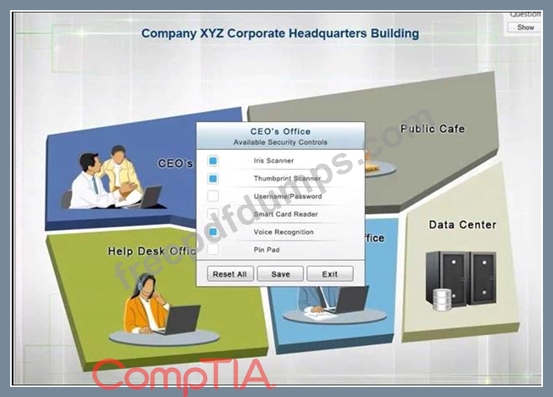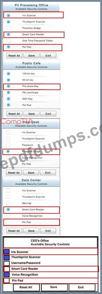You have just received some room and WiFi access control recommendations from a security consulting company. Click on each building to bring up available security controls. Please implement the following requirements: