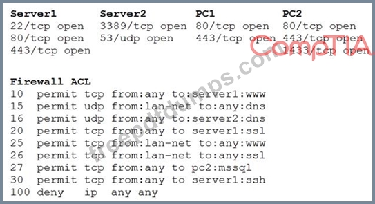 A security analyst reviews the following aggregated output from an Nmap scan and the border firewall ACL: