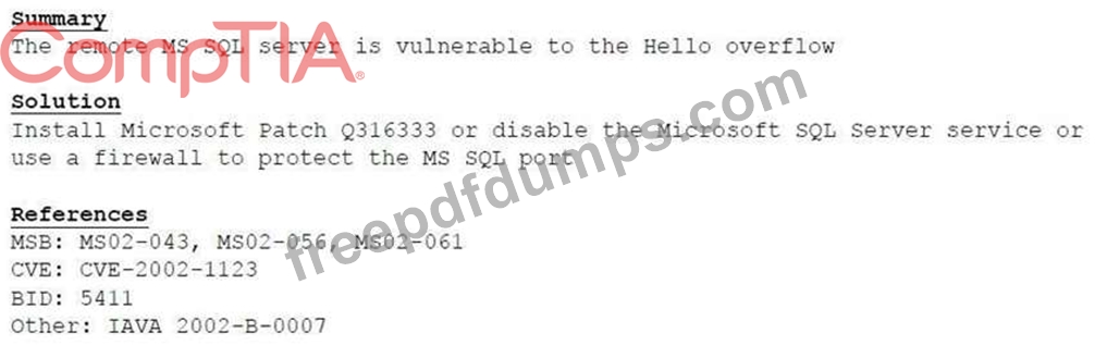 A cybersecurity consultant is reviewing the following output from a vulnerability scan against a newly installed MS SQL Server 2012 that is slated to go into production in one week: