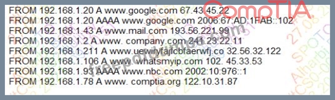 A security analyst is reviewing the following DNS logs as part of security-monitoring activities: