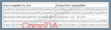 A security analyst is running a tool against an executable of an unknown source. The Input supplied by the tool to the executable program and the output from the executable are shown below: