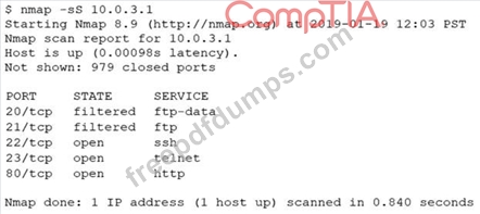 An analyst performs a routine scan of a host using Nmap and receives the following output: