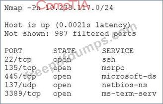 A security analyst scanned an internal company subnet and discovered a host with the following Nmap output.