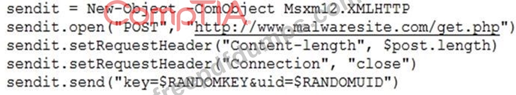 Based on the information from the code snippet, which of the following is the BEST way for a cybersecurity professional to monitor for the same malware in the future?