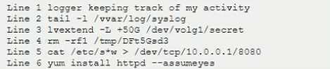 During a routine log review, a security analyst has found the following commands that cannot be identified from the Bash history log on the root user.