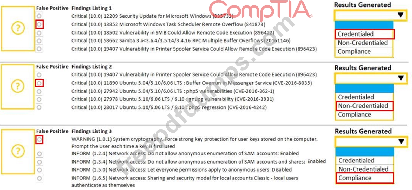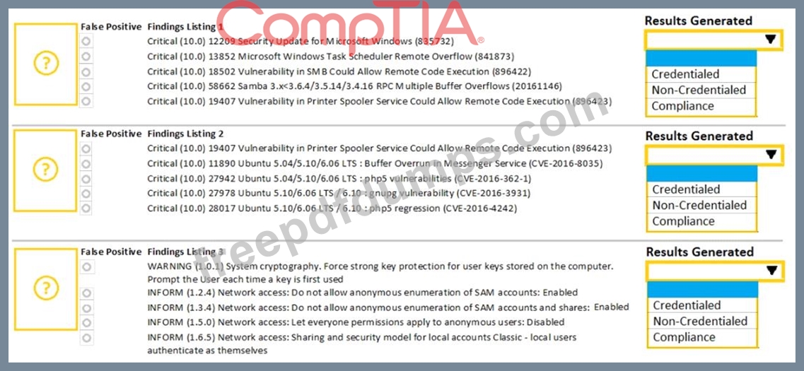 A security analyst performs various types of vulnerability scans. Review the vulnerability scan results to determine the type of scan that was executed and if a false positive occurred for each device.