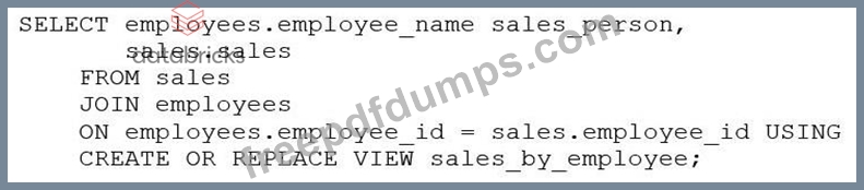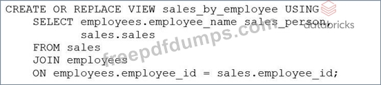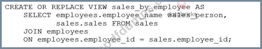 A business analyst has been asked to create a data entity/object called sales_by_employee. It should always stay up-to-date when new data are added to the sales table. The new entity should have the columns sales_person, which will be the name of the employee from the employees table, and sales, which will be all sales for that particular sales person. Both the sales table and the employees table have an employee_id column that is used to identify the sales person.