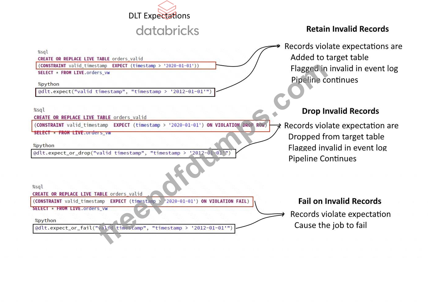 A dataset has been defined using Delta Live Tables and includes an expectations clause: CON-STRAINT valid_timestamp EXPECT (timestamp > '2020-01-01') ON VIOLATION DROP ROW What is the expected behavior when a batch of data containing data that violates these constraints is processed?