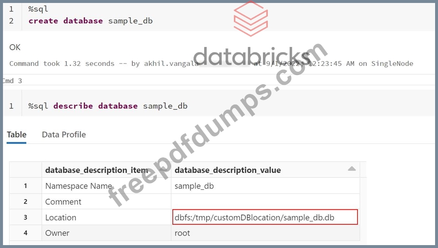 If you create a database sample_db with the statement CREATE DATABASE sample_db what will be the default location of the database in DBFS?