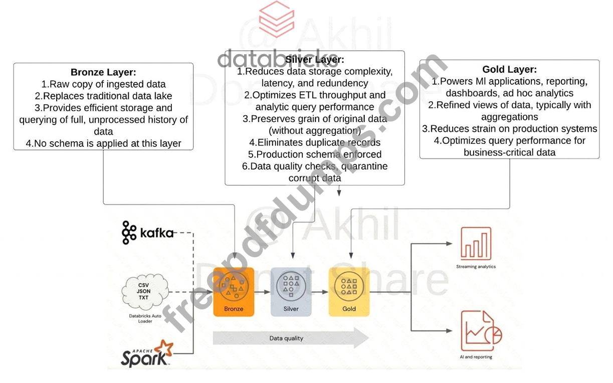 Explanation The answer is 1.spark\ 2..readStream\ 3..format("cloudFiles") \# use Auto loader 4..option("cloudFiles.format","csv") \ # csv format files 5..option("cloudFiles.schemaLocation", checkpoint_directory)\ 6..load('landing')\ 7..writeStream.option("checkpointLocation", checkpoint_directory)\ 8..table(raw) Note: if you chose the below option which is incorrect because it does not have readStream 1.spark.read.format("cloudFiles") 2..option("cloudFiles.format","csv") 3.... 4... 5... Exam focus: Please review the below image and understand the role of each layer(bronze, silver, gold) in medallion architecture, you will see varying questions targeting each layer and its purpose. Sorry I had to add the watermark some people in Udemy are copying my content. A diagram of a house Description automatically generated with low confidence