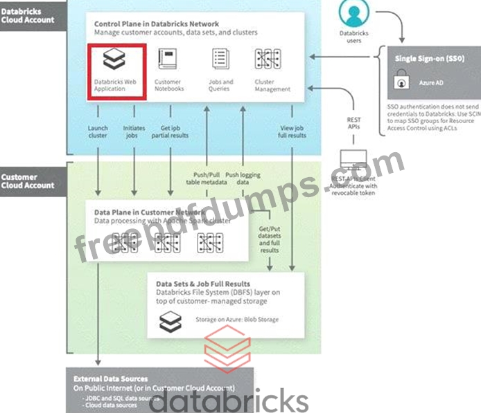 Explanation The answer is Databricks Web Application Azure Databricks architecture overview - Azure Databricks | Microsoft Docs Databricks operates most of its services out of a control plane and a data plane, please note serverless features like SQL Endpoint and DLT compute use shared compute in Control pane. Control Plane: Stored in Databricks Cloud Account * The control plane includes the backend services that Databricks manages in its own Azure account. Notebook commands and many other workspace configurations are stored in the control plane and encrypted at rest. Data Plane: Stored in Customer Cloud Account * The data plane is managed by your Azure account and is where your data resides. This is also where data is processed. You can use Azure Databricks connectors so that your clusters can connect to external data sources outside of your Azure account to ingest data or for storage. Timeline Description automatically generated Bottom of Form Top of Form