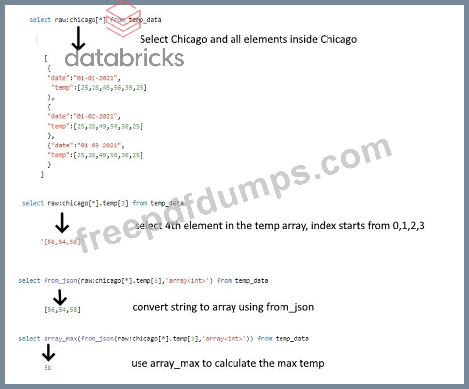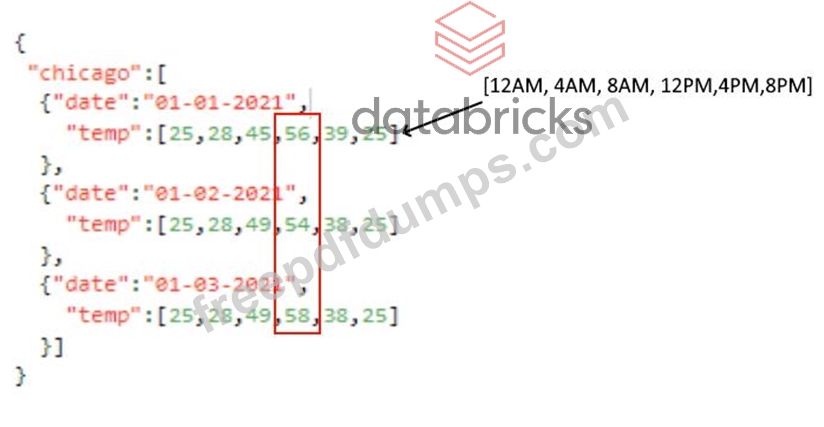 Below table temp_data has one column called raw contains JSON data that records temperature for every four hours in the day for the city of Chicago, you are asked to calculate the maximum temperature that was ever recorded for 12:00 PM hour across all the days. Parse the JSON data and use the necessary array function to calculate the max temp.