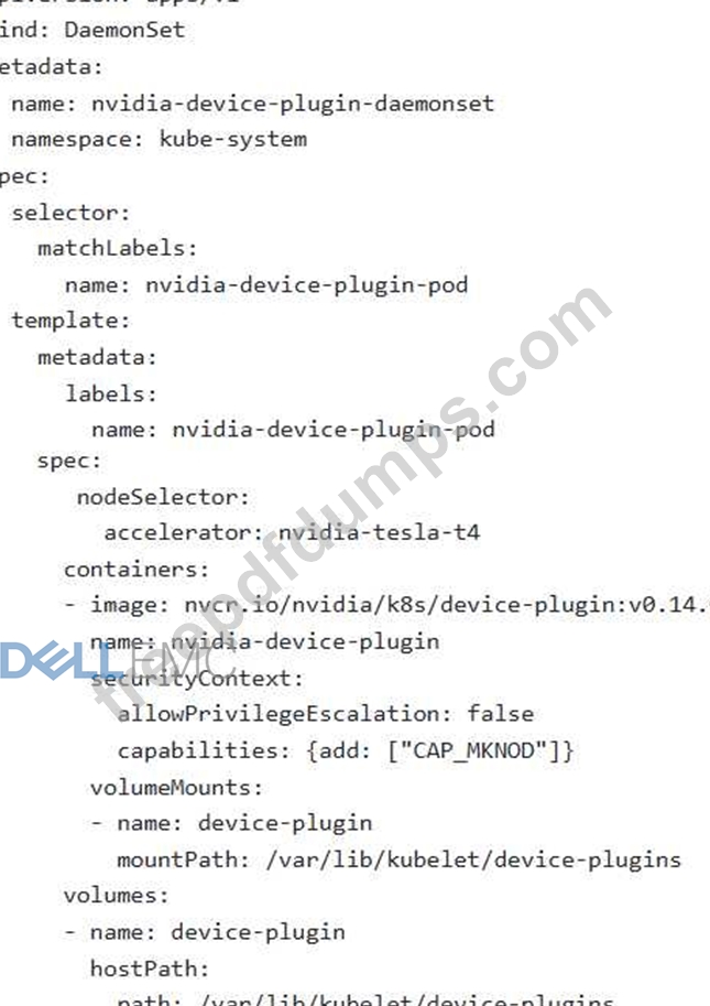 Consider this YAML snippet for deploying the NVIDIA device plugin. Which statement is true about the highlighted segment?