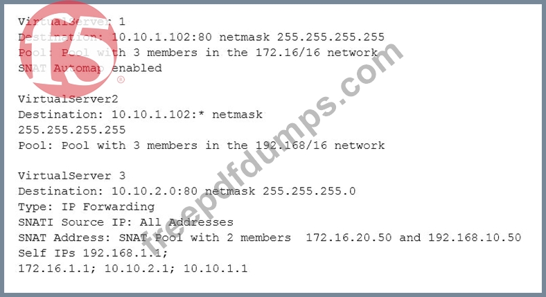 Click the Exhibit Button an LTM has the 3 virtual servers, a SNAT defined, four self IP addresses defined and the networks shown in the exhibit. Selected options for each object are shown below. Settings not shown are at their defaults.