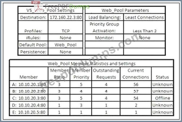 The incoming client IP address is 205.12.45.52. The last five connections have been sent to members C, D, A, B, B. Given the virtual server and pool definitions and the statistics shown in the graphic, which member will be used for the next connection?