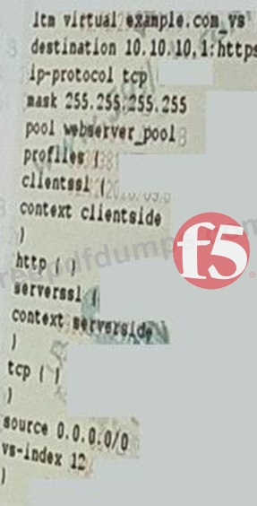 A web server is being overloaded with HTTPS traffic. To decrease the load on the server, the LTM Specialist and the Server. Administrator decide to perform SSL offloading on the LTM device. The configuration of the virtual server is as follows: