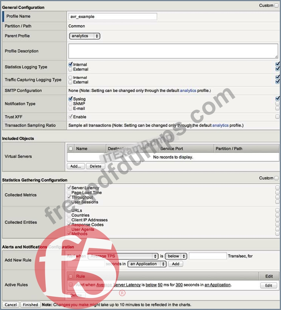 An LTM Specialist sets up AVR alerts and notifications for a specific virtual server if the server latency exceeds 50ms. The LTM Specialist simulates a fault so that the server latency is consistently exceeding the 50ms threshold; however, no alerts are being received.