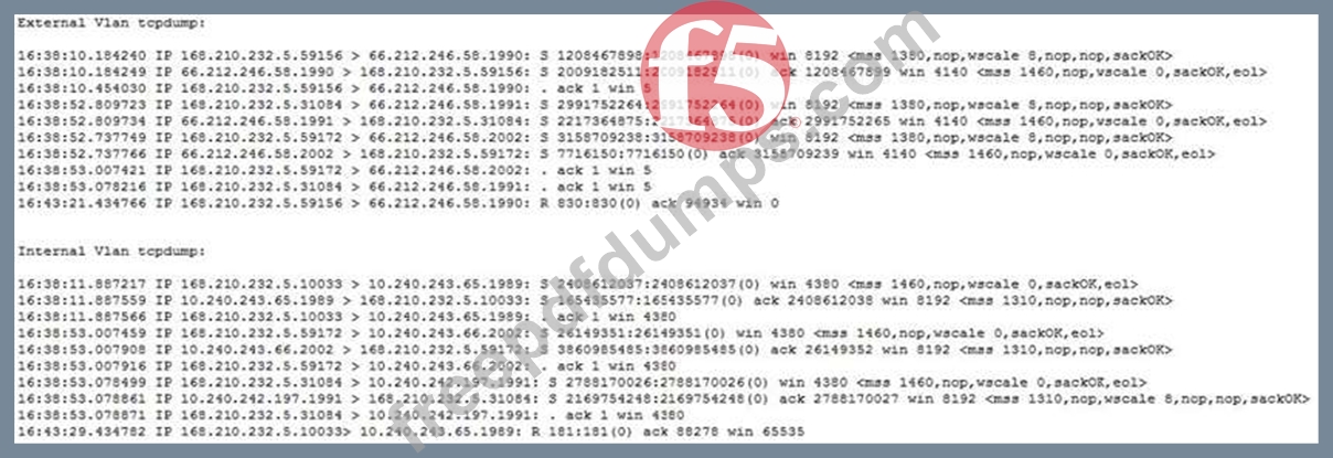The LTM Specialist has the tcpdump extract and knows the client software has at least one connection to a VS on port 1990. However, when a tcpdump runs on the internal VLAN, there is no record of port 1990 in the tcpdump.