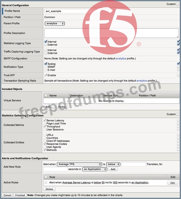 An LTM Specialist sets up AVR alerts and notifications for a specific virtual server if the server latency exceeds 50ms. The LTM Specialist simulates a fault so that the server latency is consistently exceeding the 50ms threshold; however, no alerts are being received.