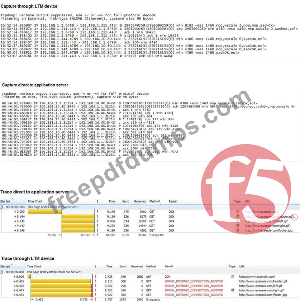 An LTM Specialist has configured a virtual server to distribute connections to a pool of application servers and to offload SSL processing. The application fails to work as expected when connecting to the virtual server. It does work when clients connect directly to the application. Two packet captures were taken at the application server.