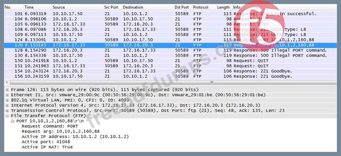 An LTM Specialist is investigating reports that users are unable to perform some commands through an FTP virtual server. The users are receiving the FTP error "500 Illegal PORT command." The virtual server is configured to SNAT using automap. The LTM Specialist performs a capture on the server side of the LTM device.