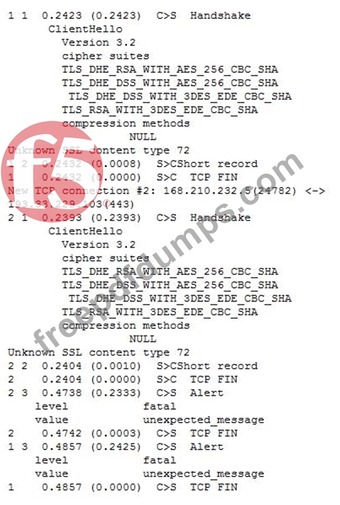 The LTM Specialist does an ssldump on the virtual server and receives the results as per the exhibit.