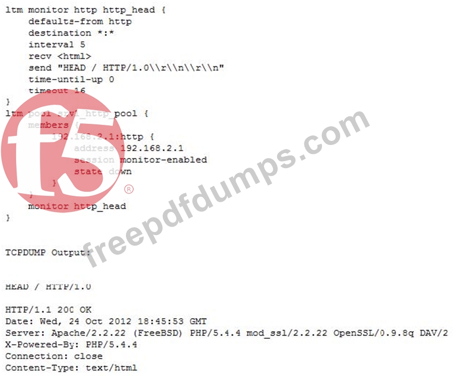 An LTM Specialist is troubleshooting a new HTTP monitor on a pool. The pool member is functioning correctly when accessed directly through a browser, although the monitor is marking the member as down. As part of the troubleshooting, the LTM Specialist has captured the monitor traffic via tcpdump.