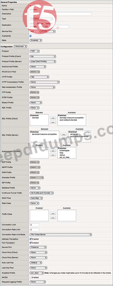 -- Exhibit - -- Exhibit -Refer to the exhibit. An LTM Specialist is troubleshooting a virtual server. Both the virtual server and the pool are