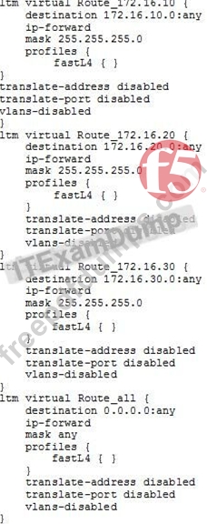 An LTM device has been configured for load balancing a number of different application servers. Configuration changes need to be made to the LTM device to allow administrative management of the servers in 172.16.10/24, 172.16.20/24, and 172.16.30/24 networks. The servers require outbound access to numerous destinations for operations.