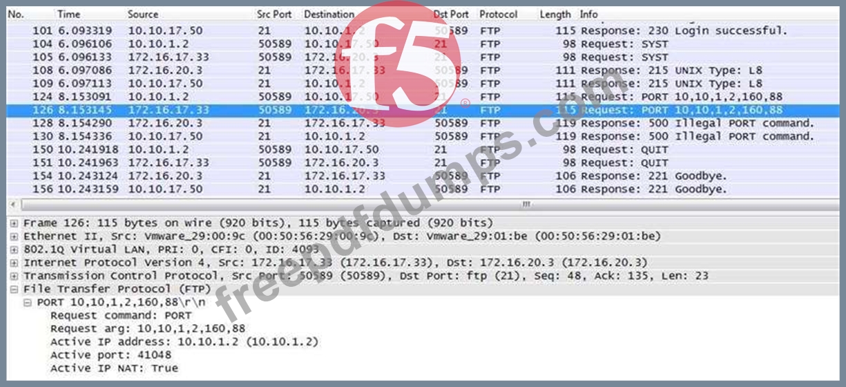 An LTM Specialist is investigating reports that users are unable to perform some commands through an FTP virtual server. The users are receiving the FTP error "500 Illegal PORT command." The virtual server is configured to SNAT using automap. The LTM Specialist performs a capture on the server side of the LTM device.
