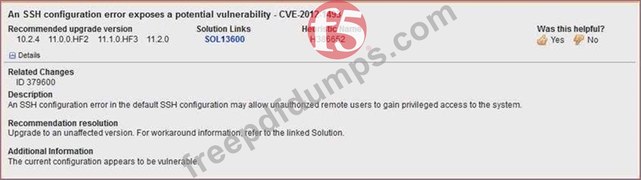 An LTM Specialist is working on an LTM 11.0.0 installation and has identified a security vulnerability as shown in the exhibit. The LTM Specialist is tasked with applying the latest available hotfix to resolve the problem.