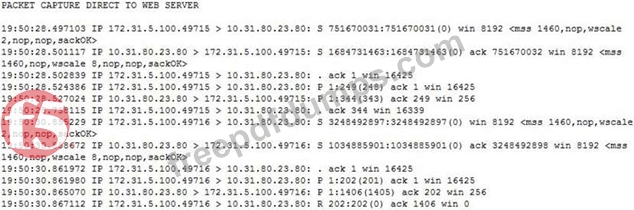 Users are able to access the application when connecting directly to the web server but are unsuccessful when connecting to the virtual server. Return traffic bypasses the LTM device using Layer 2 nPath routing.