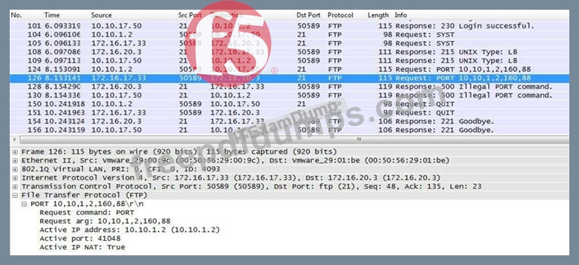 An LTM Specialist is investigating reports that users are unable to perform some commands through an FTP virtual server. The users are receiving the FTP error "500 Illegal PORT command." The virtual server is configured to SNAT using automap. The LTM Specialist performs a capture on the server side of the LTM device.