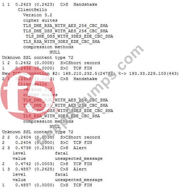 The LTM Specialist does an ssldump on the virtual server and receives the results as per the exhibit.