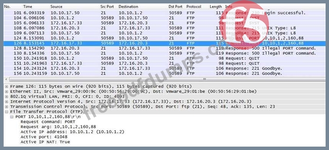 An LTM Specialist is investigating reports that users are unable to perform some commands through an FTP virtual server. The users are receiving the FTP error "500 Illegal PORT command." The virtual server is configured to SNAT using automap. The LTM Specialist performs a capture on the server side of the LTM device.