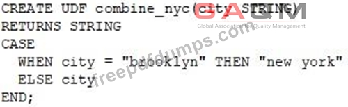 A data engineer needs to apply custom logic to string column city in table stores for a specific use case. In order to apply this custom logic at scale, the data engineer wants to create a SQL user-defined function (UDF).