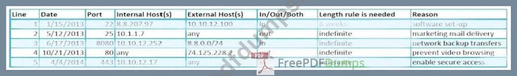 Dragonfly Industries requires firewall rules to go through a change management system before they are configured. Review the change management log. Which of the following lines in your firewall ruleset has expired and should be removed from the configuration?
