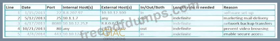 Dragonfly Industries requires firewall rules to go through a change management system before they are configured. Review the change management log. Which of the following lines in your firewall ruleset has expired and should be removed from the configuration?