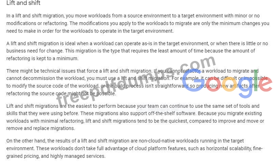 A customer has contacted you about migrating to Google Cloud. The customer would like to mi-grate their data from on premises as soon as possible. They don't have the budget to rewrite code, and they want the most direct route. What migration option should suggest to the customer?
