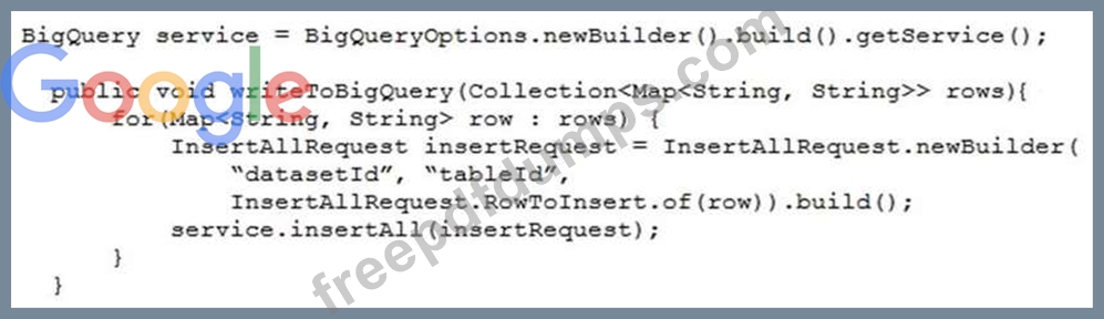 Your teammate has asked you to review the code below. Its purpose is to efficiently add a large number of small rows to a BigQuery table.