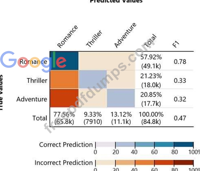 Given the following confusion matrix for a movie classification model, what is the true class frequency for Romance and the predicted class frequency for Adventure?