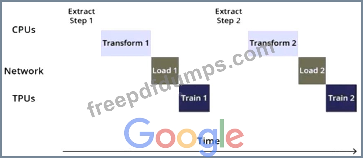 You are training an object detection model using a Cloud TPU v2. Training time is taking longer than expected. Based on this simplified trace obtained with a Cloud TPU profile, what action should you take to decrease training time in a cost-efficient way?