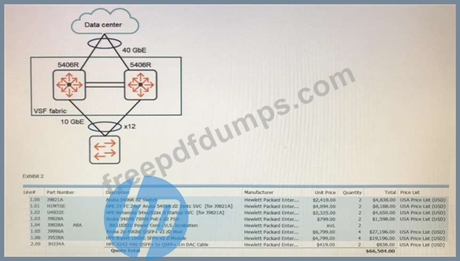 Exhibit 1 shows the logical plan, and Exhibit 2 shows the BOM created with IRIS. An architect plans to propose two 5406Rzl switches as a VSF fabric for a campus network core. Which issue with the plan should the architect correct?