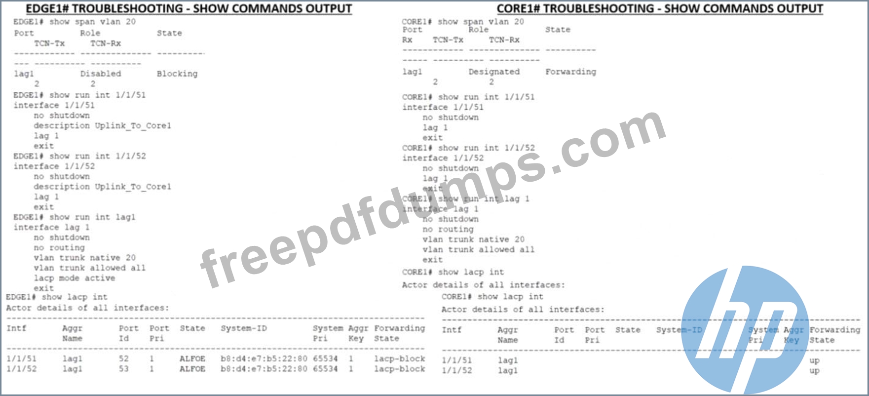 You put in a few show commands on switches EDGE1 and CORE1 to attempt to gather information to troubleshoot the issue Use the show command output images to determine the reason for the EDGE1 uplink being down